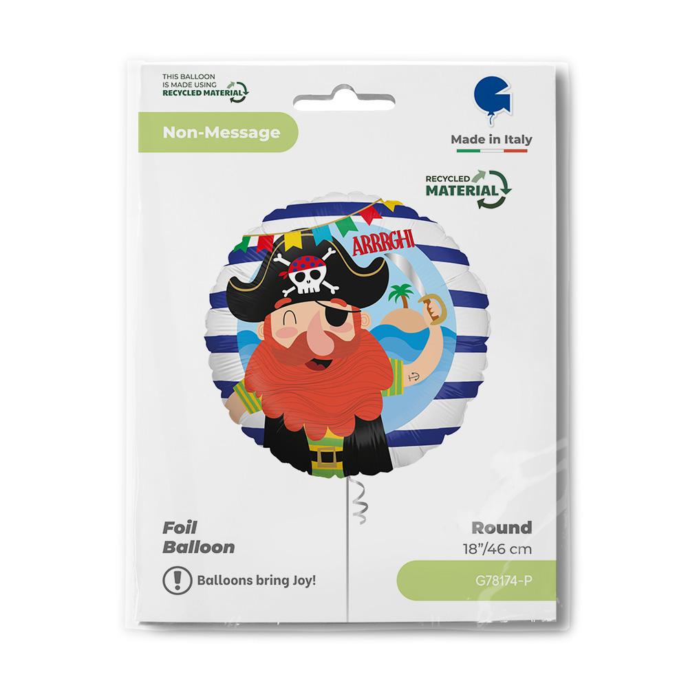 The 'ARRRGH!' Pirate Foil Balloon is a lively and fun addition to pirate-themed celebrations. This round foil balloon features a cheerful cartoon pirate with a red beard, a black hat adorned with a skull and crossbones, and a striped shirt. The pirate holds a hook, standing against a playful backdrop of a beach scene with a palm tree. The phrase 'ARRRGH!' in bold red letters adds to the excitement. Crafted in Italy using high-quality, eco-friendly recycled foil material, this balloon measures 18 inches (46 cm) in diameter. Lightweight and helium-compatible, it inflates quickly and offers vibrant, long-lasting decor for birthday parties, themed events, or just a dose of swashbuckling fun!