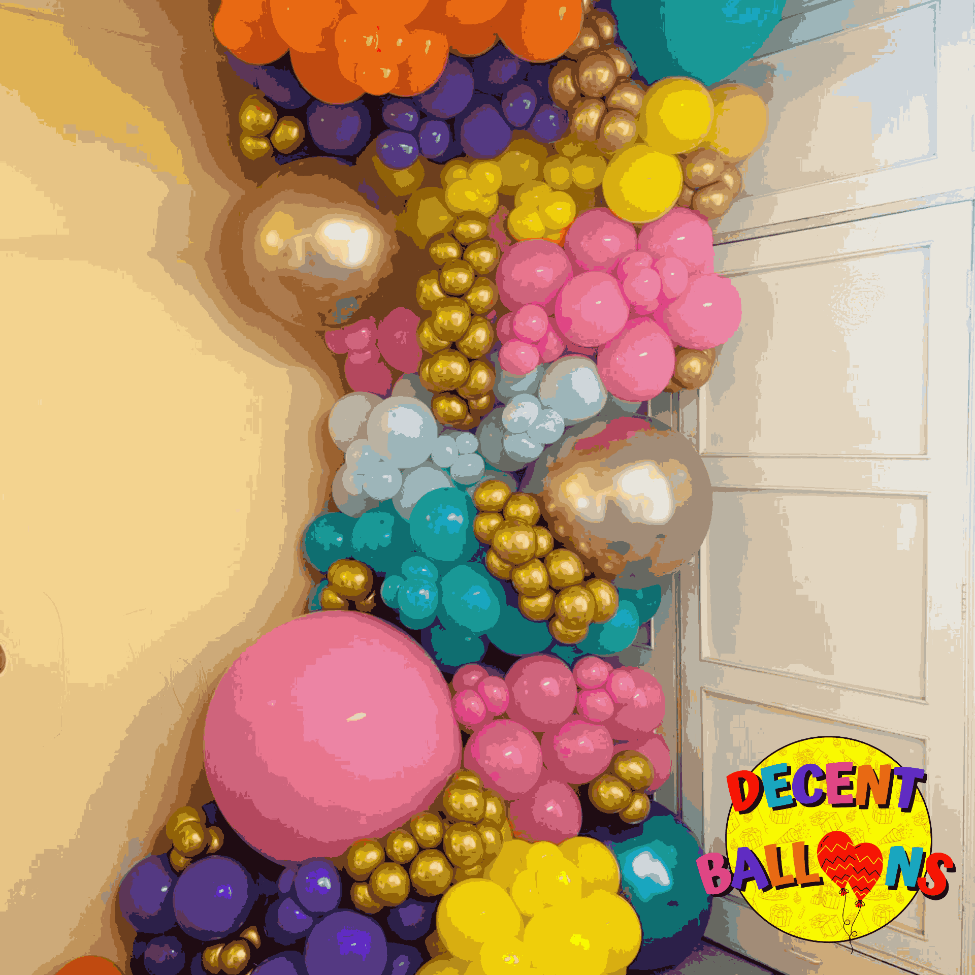 Celebrate your special day in style with Decent Metallic Balloon Birthday Decor – designed to make your event unforgettableTransform your birthday celebration into a visual treat with Decent Metallic Balloon Birthday Decor! This stunning setup includes an arrangement of metallic balloons in a lively mix of pink, purple, blue, yellow, orange, and gold. The dense design elegantly frames doorways and walls, creating the perfect backdrop for joyous gatherings. Highlighting the festive brilliance, the metallic sheen enhances the lively atmosphere, making it ideal for milestone birthdays, children's parties, or even themed celebrations.