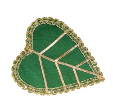 This heart-shaped pooja mat, designed like a sacred paan leaf, is an exquisite addition to Hindu rituals, poojas, and religious ceremonies. Made with premium-quality fabric, it is adorned with golden lacework and intricate detailing, making it perfect for offering prayers to deities, performing aarti, and placing religious idols.