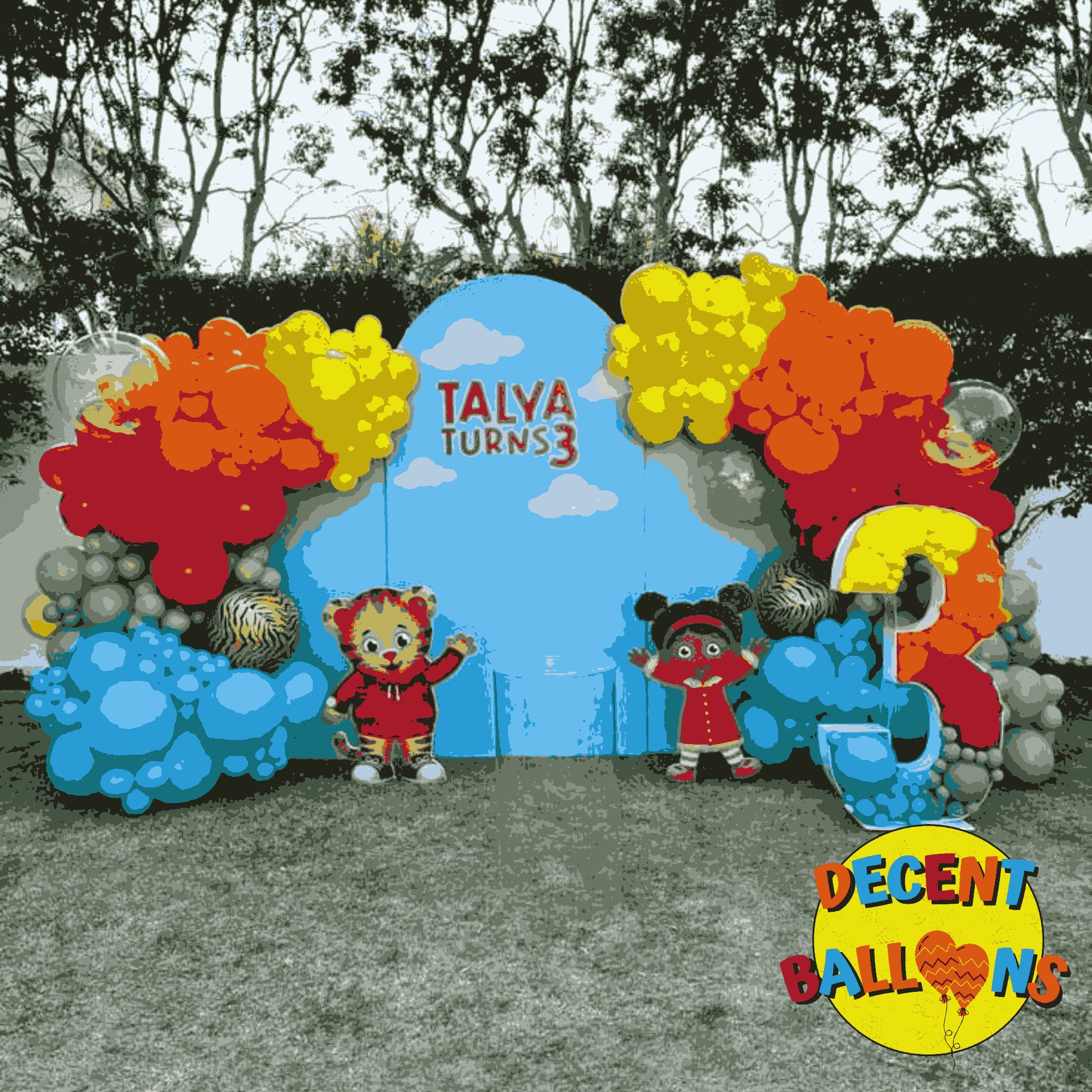 Turn your birthday celebration into a fun-filled adventure with the Daniel Tiger & Friends Birthday Decor! This vibrant setup features colorful balloon clusters in shades of orange, yellow, red, green, and blue, creating an energetic and cheerful ambiance. The whimsical character-themed backdrop adds a playful touch, perfect for children’s parties or themed celebrations. This delightful design is perfect for memorable photos and endless laughter.