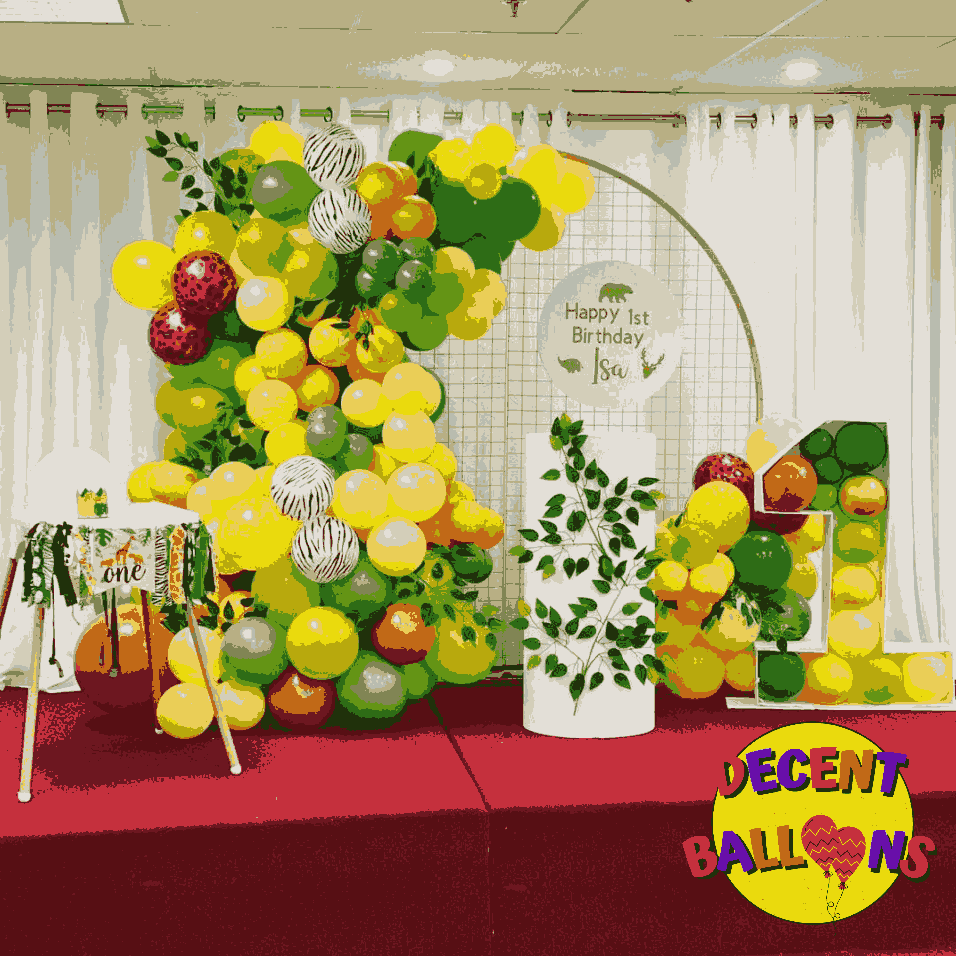 Transform your child’s first birthday into a Jurassic wonderland with Dinosaur Adventure Birthday Decor! This lively setup features vibrant balloon clusters in shades of green, yellow, orange, and white, creating an energetic and cheerful ambiance. The playful dinosaur-themed accents, including a personalized circular backdrop and decorated high chair, add charm and fun to the setting. Perfect for milestone celebrations, this decor blends thematic creativity with visual appeal to delight children and guests alike.