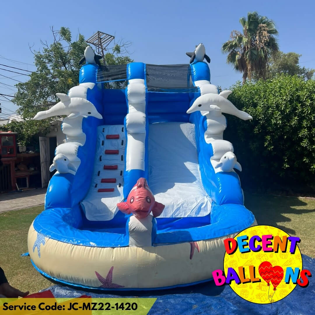 This vibrant blue-and-white setup features a wide climbing ramp, playful dolphin figures, and a built-in splash pool for instant cool-downs. A cheeky red fish adds character at the base, while the marine styling makes it a visual showstopper for birthdays, school carnivals, and weekend playdates ππΈ.