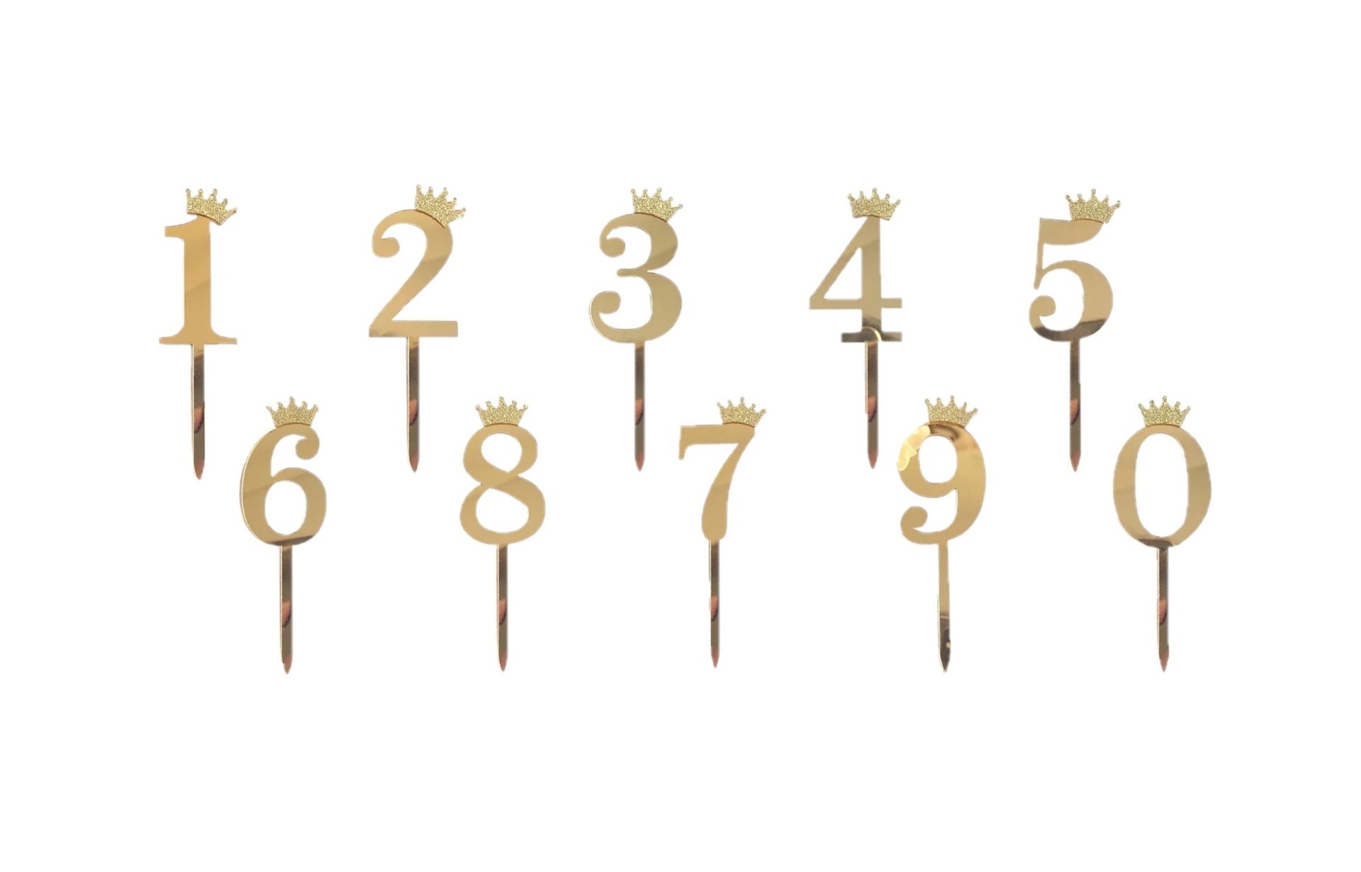 A golden crown numbers cake topper is a charming and elegant decorative piece designed to adorn celebratory cakes, such as birthday or anniversary cakes. It features two elements: a regal crown motif and numerical digits representing the age or milestone being celebrated. Gold Number Cake Toppers