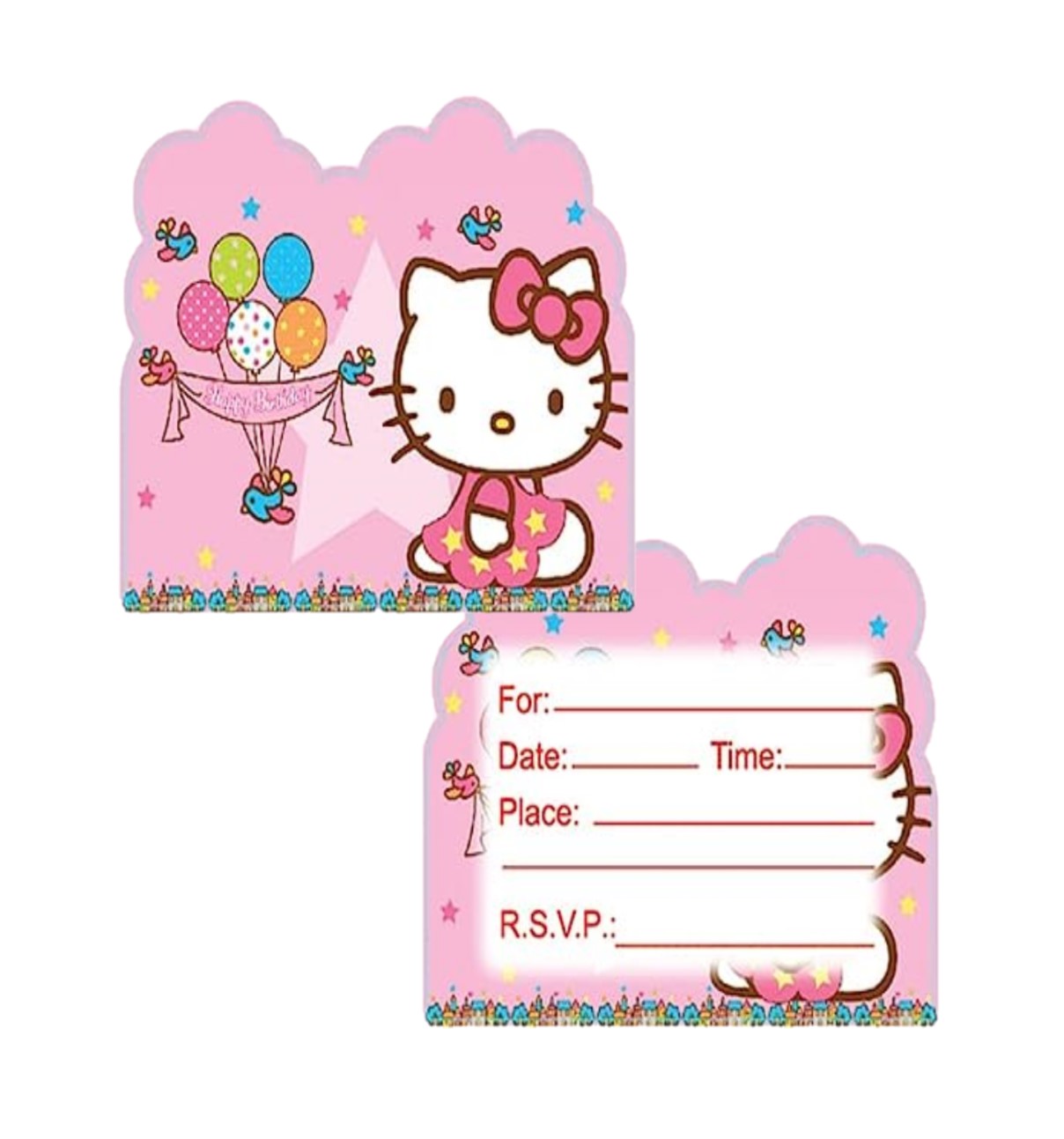 Step into a world of whimsy and joy with our Hello Kitty invitation cards! Embrace enchanting designs featuring adorable Hello Kitty. These invites will surely bring smiles to your guest's faces. Get ready for a birthday bash filled with laughter and delightful memories. Send your perfect invitation now and let the celebration begin! Hello Kitty Invitations