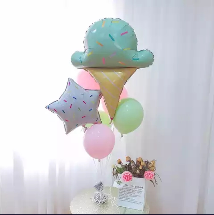 An ice cream foil balloon is a delightful and whimsical decoration that replicates the appearance of an ice cream cone or an ice cream scoop. These balloons are typically made from metallic, shiny materials like Mylar or foil, which give them a vibrant and eye-catching look. foil balloon icecream balloon