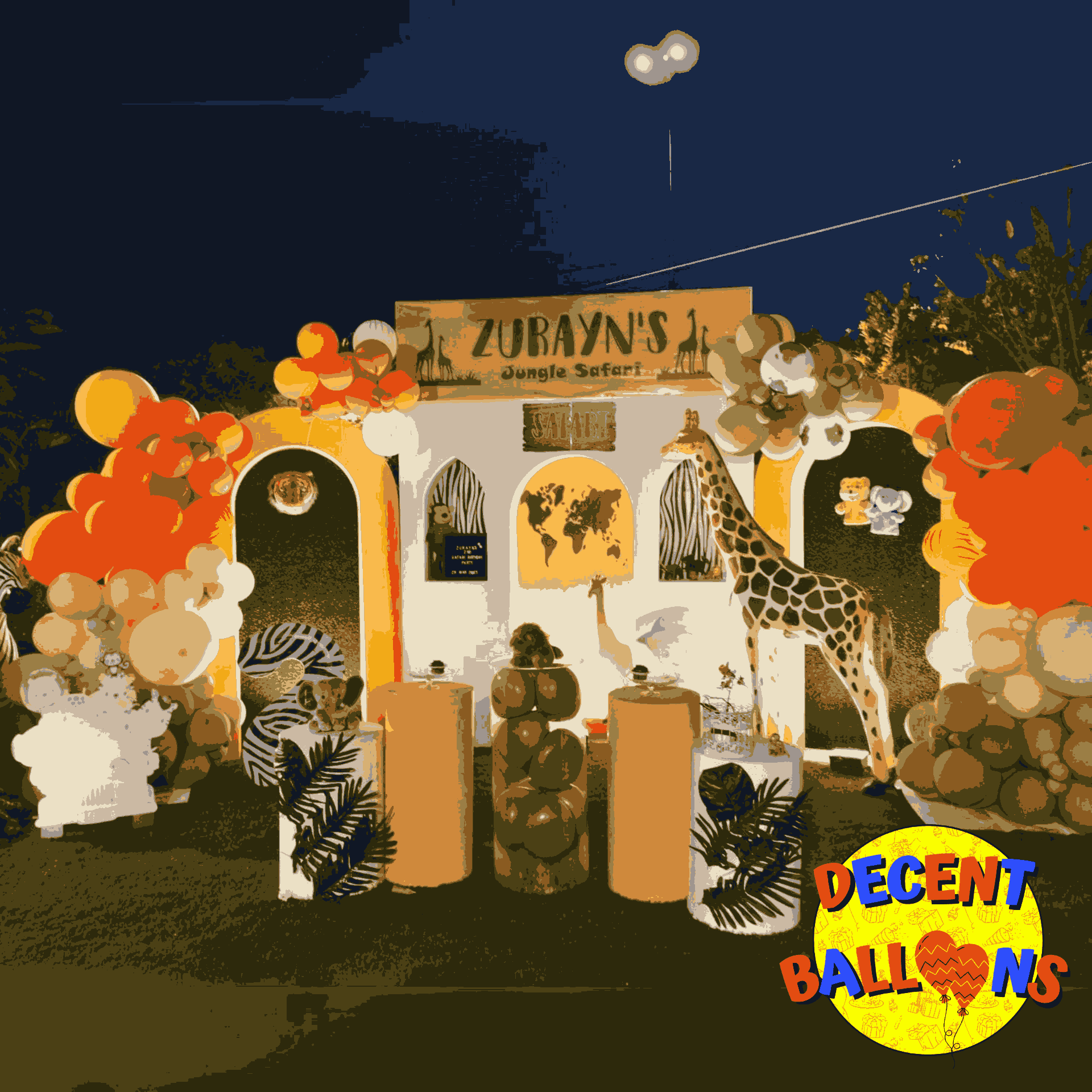Bring the spirit of adventure to your celebration with Jungle Safari Balloon Decor! This dynamic setup features clusters of balloons in earthy tones of orange, white, and green, complemented by animal cutouts like giraffes and lush foliage accents. Perfect for outdoor or indoor settings, this decor transforms your space into a jungle safari adventure, complete with vibrant colors and engaging visuals that delight children and adults alike.