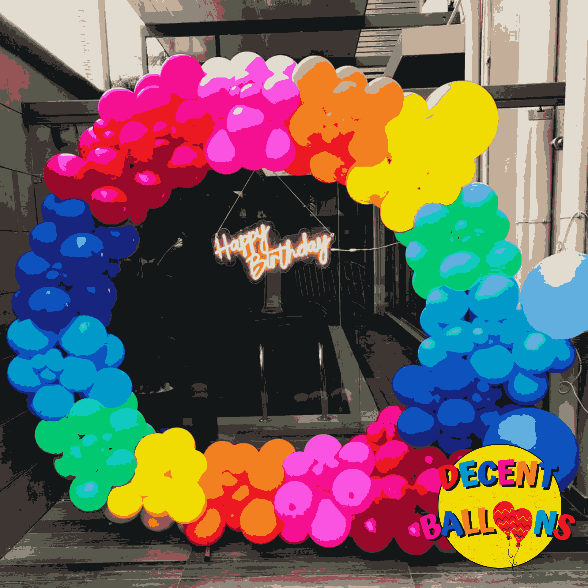 Add a pop of color and energy to your celebration with the Rainbow Balloon Ring Decor! This festive setup features a stunning circular arrangement of balloons in a smooth gradient of bright hues like red, pink, orange, yellow, green, blue, and purple. At the center of this vibrant ring is a charming neon sign that adds a modern touch to the overall theme. Perfect for outdoor or indoor settings, this decor is ideal for birthdays, milestone celebrations, or any event that calls for a cheerful and lively vibe.