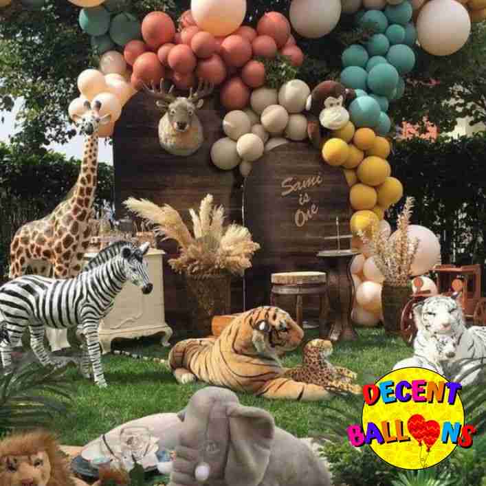 Step into the wild with Safari Balloon Birthday Decor, a lively setup perfect for kids' parties and jungle-themed celebrations! The decor showcases animal figurines, including a giraffe, lion, tiger, zebra, and elephant, set against a tropical-inspired backdrop. Vibrant balloons in earthy tones like orange, green, brown, yellow, and beige create a striking arch to complete the look. Decorative plants and natural elements enhance the setup, making it visually captivating and fun for all.