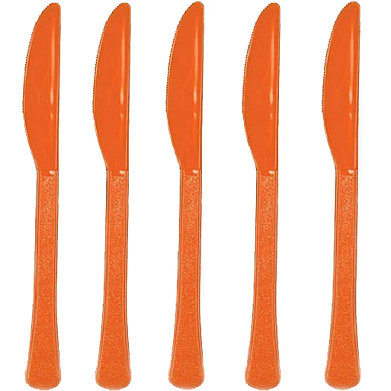 Complete your guests’ cravings by adding these Orange Peel Heavy Weight Plastic Knives to your table setting! It comes in solid orange color disposable plastic knives that can neutrally suit any kind of party occasion or theme. Orange Plastic Knives, Pack of 24