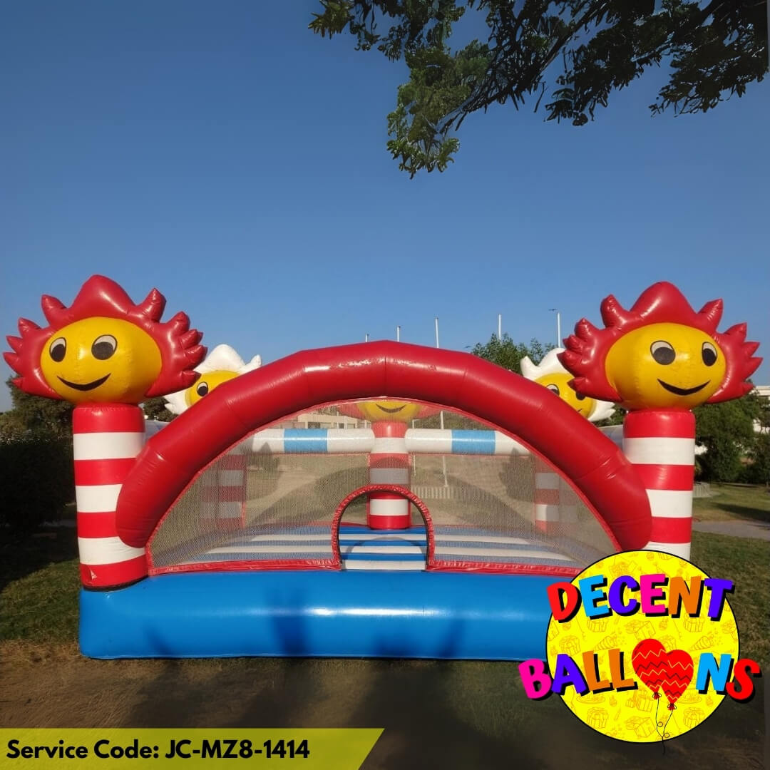 With bold red and white striped columns topped by cheerful sunburst faces, this castle creates an instant carnival vibe. The mesh front keeps the action visible and safe, while the padded base ensures smooth landings. Whether it’s a birthday party, school fair, or weekend celebration, this setup guarantees smiles, laughter, and viral-worthy photos 💛📸.