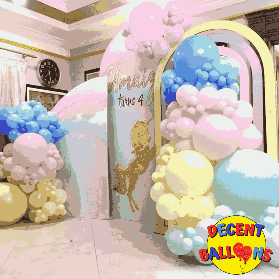 Turn your party into a fairytale with Unicorn Pastel Balloon Decor! This enchanting setup features clusters of pastel-colored balloons in shades of pink, blue, yellow, and green, forming a magnificent arch. A dreamy backdrop adorned with a rainbow design and golden unicorn elements enhances the magical ambiance. Perfect for birthday parties and themed celebrations, this decor brings a delightful and colorful vibe that captures the imagination of children and guests alike.